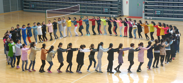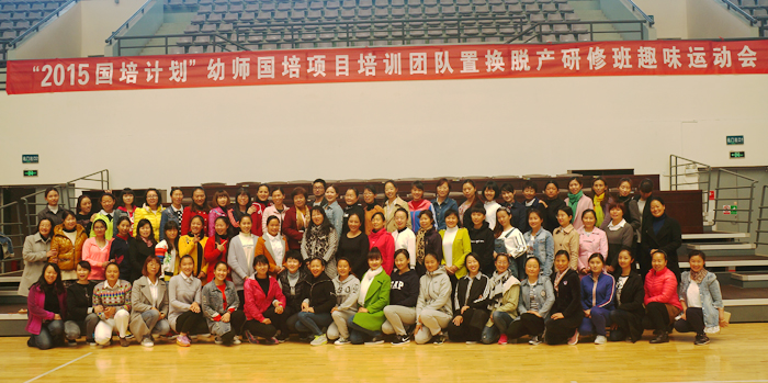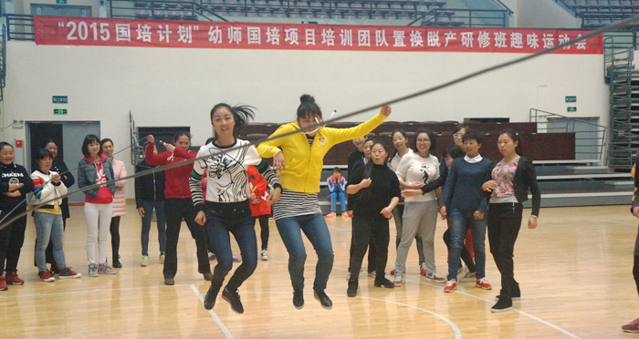 2016年3月25日下午,“国培计划2015(第2学期)”幼儿教师培训团队在洋浦校区综合训练馆举办趣味运动会。结合幼儿教师的职业需求和身心特点,教师教育学院国培团队精心设计了将竞技与娱乐相结合的五个比拼项目,既有需要团结合作的“听数抱团”和“背对背运球接力”,又有“青蛙呱呱”和“带球S跑”等适合发挥特长的个人对抗项目,当然最不可少的就是配合度和协调性兼备的“长绳接龙”。整场运动会项目设置科学,赛程紧凑合理,既紧张激烈又不失趣味性,既展示出学员们激情拼搏、敢于对抗的积极作风,又体现了学员间团结协作、风雨共进的团队精神。