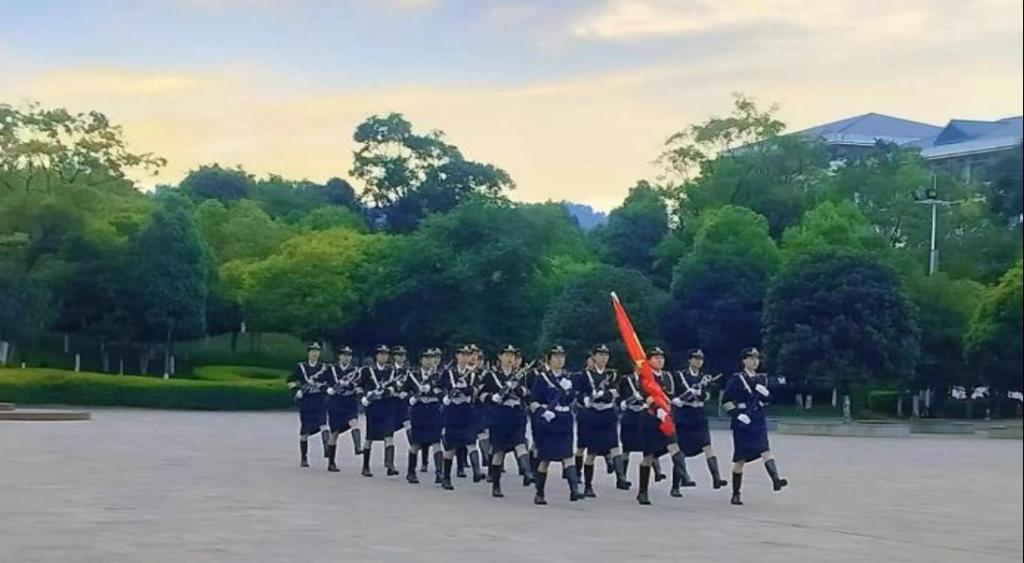 朝阳初升,欣欣向荣,国旗护卫队队员精神抖擞地迈着正步,护卫着五星红旗来到聂耳广场旗杆下,全场肃立,向五星红旗行注目礼,在庄严国歌声中,鲜艳的五星红旗冉冉上升,迎风飘扬。