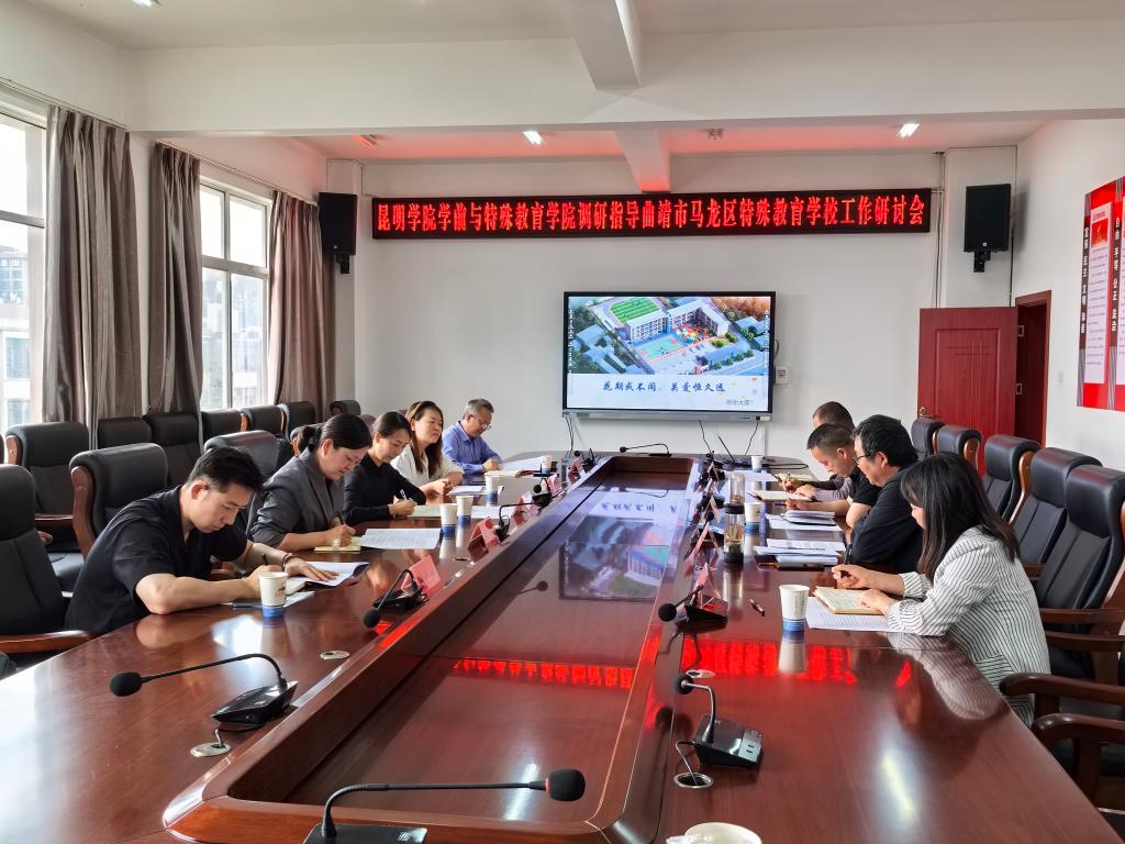 当天下午,团队前往曲靖市马龙区,参观在建的马龙区特殊教育学校,接着前往当地教育体育局,与教体局副局长、教育工委领导及马龙区特殊教育学校领导班子召开座谈会。会上,马龙区教体局副局长、教育工委领导介绍马龙区发展历程、教育规划、引才政策等情况;马龙区特校校长介绍学校教育理念、师生配比及用人需求;随后,学院党委书记向当地教体局领导和学校负责人介绍学院特殊教育专业的办学特色、人才培养及招生就业情况以及学院在0—3托育研究领域相关经验,表示今后将加强与马龙特校的对接联系,建立长效合作机制,在教师专业成长、课堂教学创新、校本教研深化,毕业生实习与就业招聘等方面加强交流合作;同时,学院与马龙区教育体育局经深入交流探讨,在学前托育领域也达成共识并建立了合作意向。