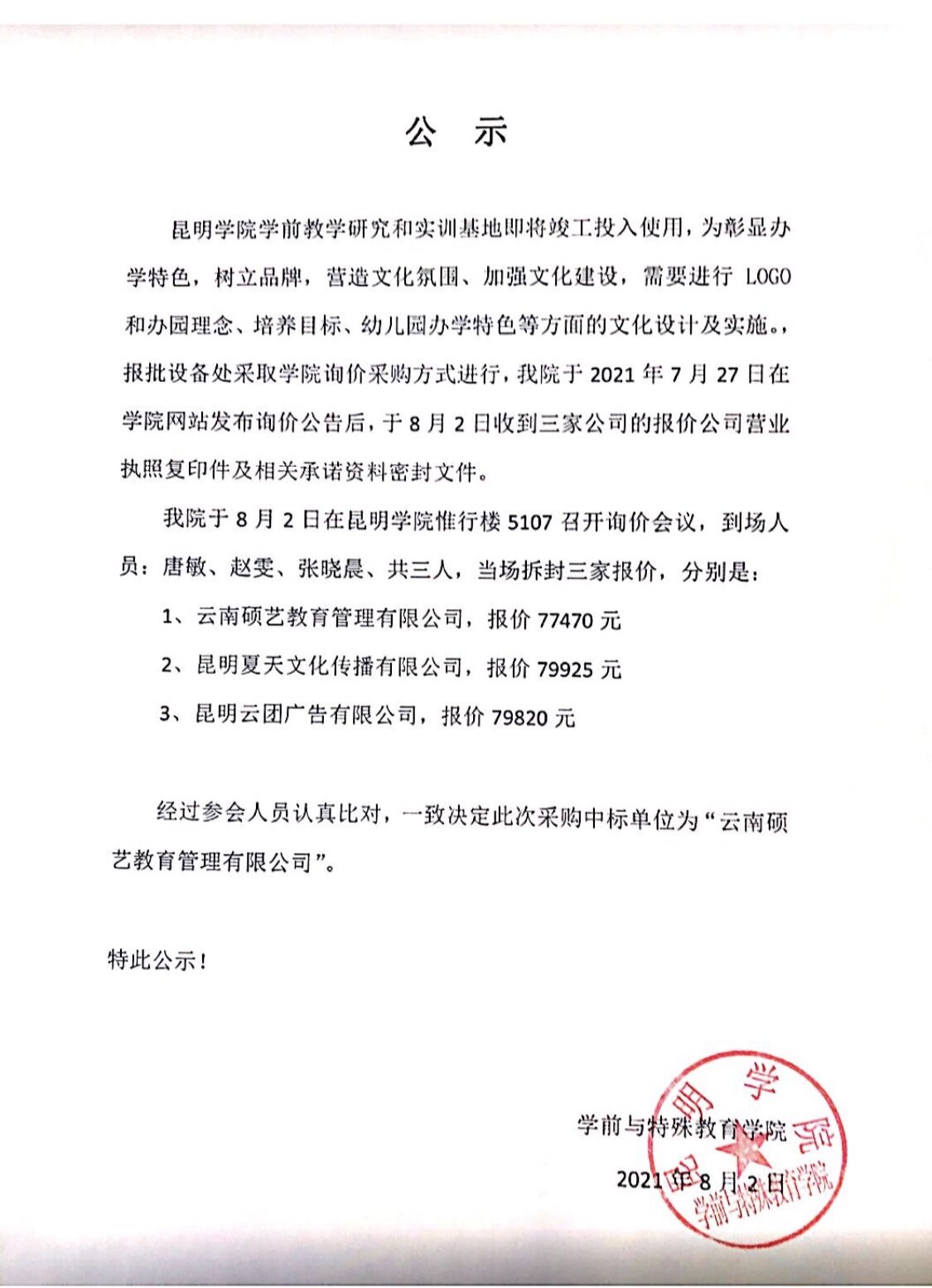 关于昆明学院学前教学研究和实训基地视觉导视项目采购中标单位的公示