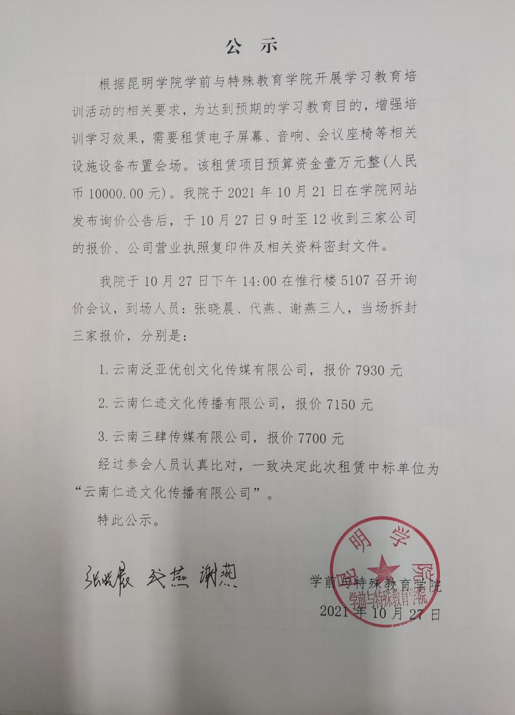 关于昆明学院学前与特殊教育学院学习教育培训活动设备租赁中标单位的公示