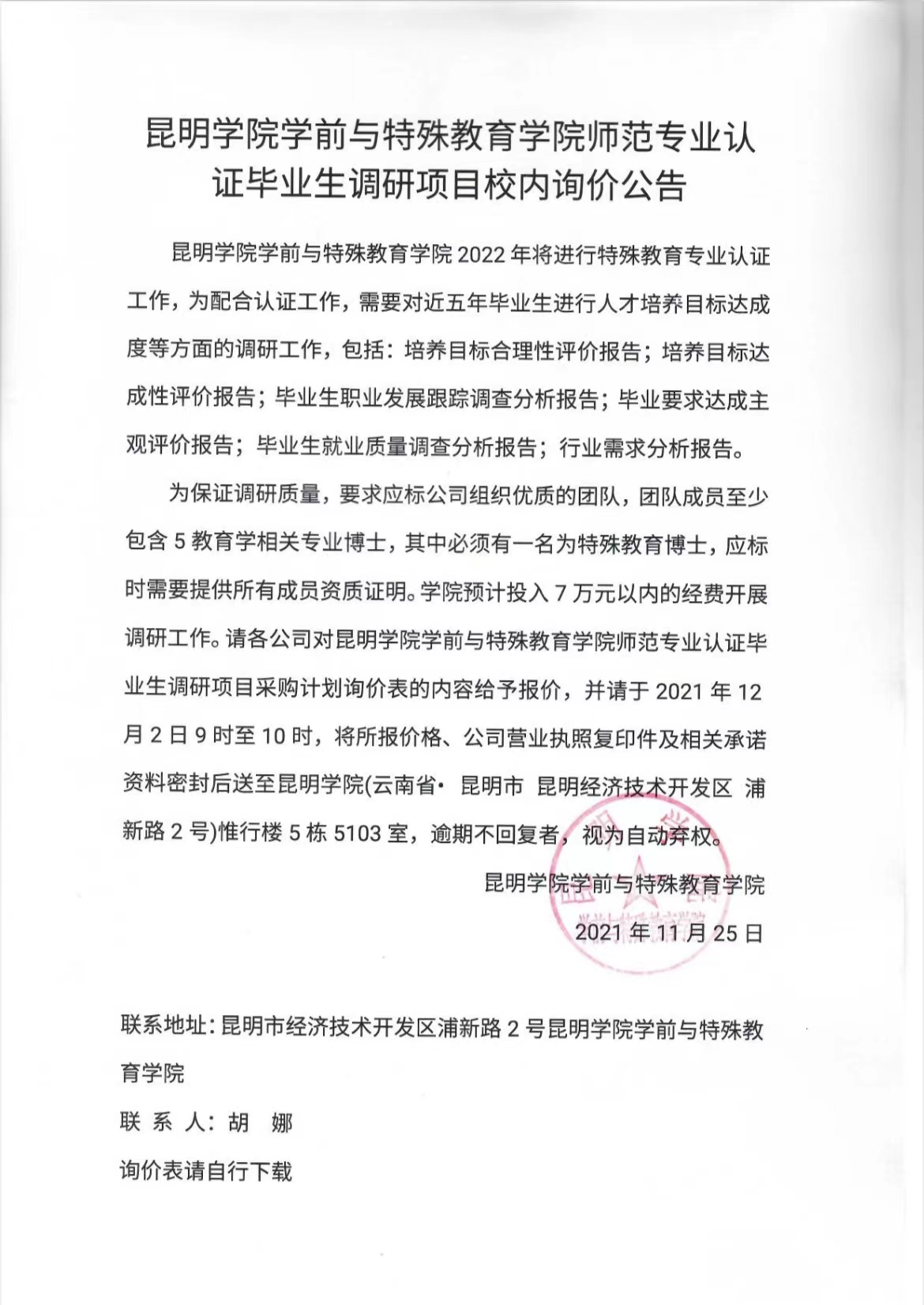 昆明学院学前与特殊教育学院师范专业认证毕业生调研项目校内询价公告