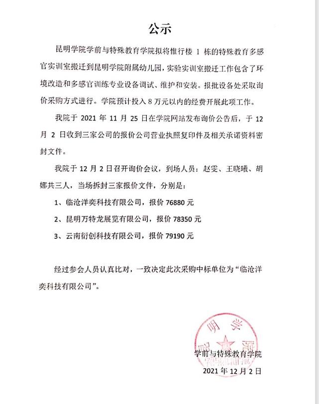 关于昆明学院学前与特殊教育学院特殊教育多感官实训室搬迁项目中标单位的公示