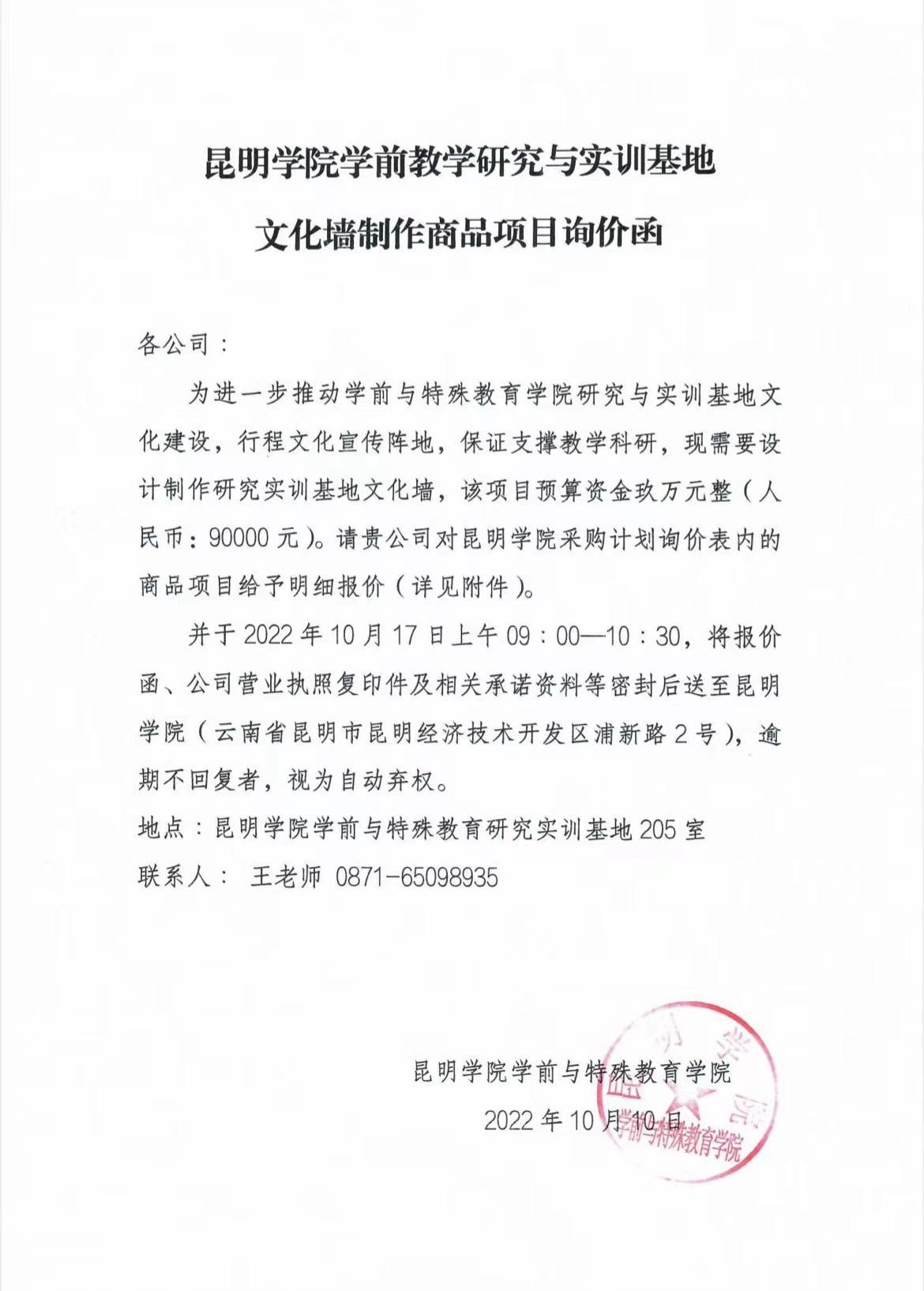 昆明学院学前教学研究与实训基地文化墙制作商品项目询价函