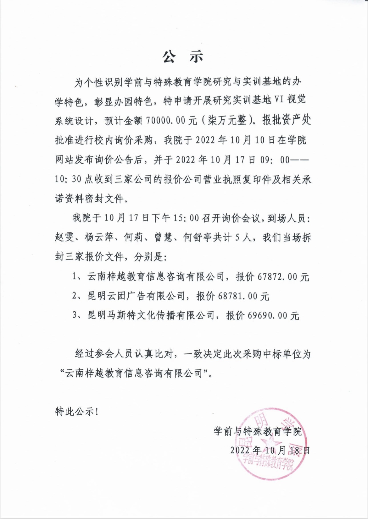 关于昆明学院学前教学研究与实训基地VI视觉系统设计服务项目中标单位的公示