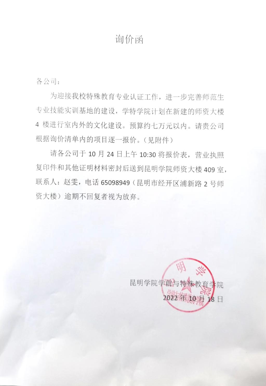 昆明学院学前与特殊教育学院四楼文化设计制作项目询价函