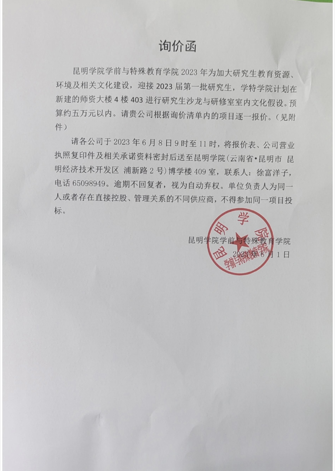 研究生沙龙和研修室项目询价函