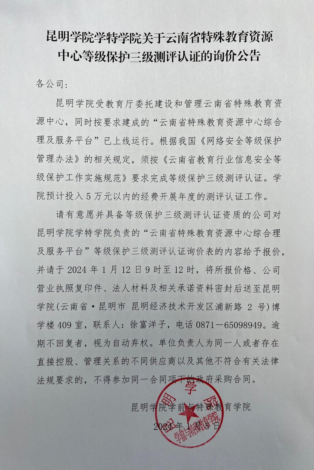 昆明学院学特学院关于云南省特殊教育资源中心等级保护三级测评认证的询价公告