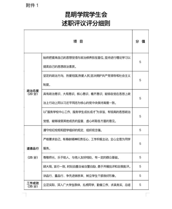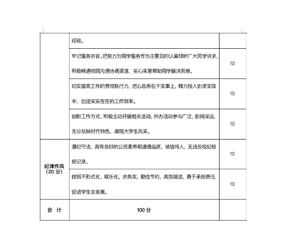 学生会组织主席团成员和工作部门负责人针对本学期所开展的主要工作和取得的实效进行述职,评议人员依据述职人的政治态度(20分)、道德品行(25分)、工作成效(35分)、纪律作风(20分)等方面,进行全面客观的综合评价。本次评分的满分为为100分,评议结果分为优、良、中、差四个等级,具体等级划分如下:得分在90-100分为优,80-89分为良,70-79分为中,70分以下为差。原则上,被评为优秀等级的人数不超过总述职人数的30%。若90分及以上的人数超过总述职人数的30%,则按分数高低排序,取总述职人数的前30%为优秀等级,其余为良好等级。