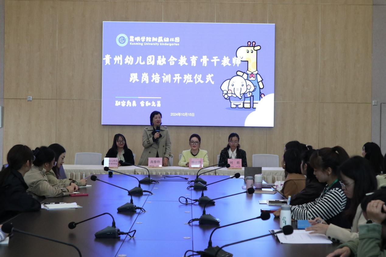 2024年10月15日上午,参训学员们在昆明学院附属幼儿园进行了开班仪式,昆明学院学前与特殊教育学院副院长高春玲教授对学员们的到来表示热烈的欢迎,并预祝未来滇黔两地精诚合作推动学前融合教育事业大力发展。